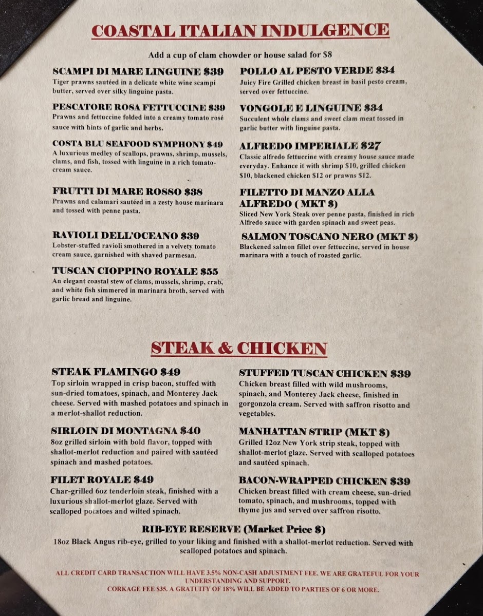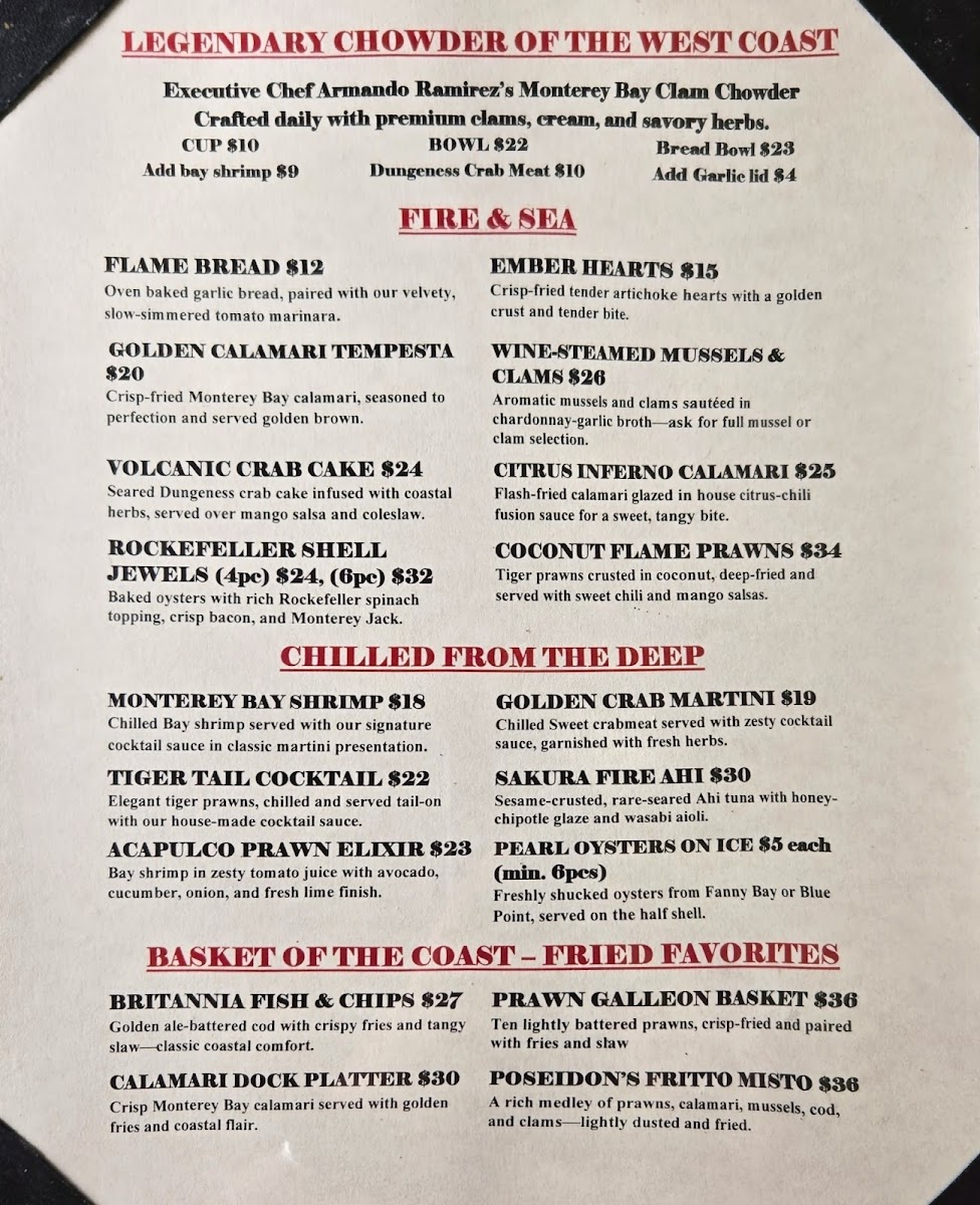 Jumbo prawns, mussels, local calamari, lobster saffron broth, over fresh red bell linguine.